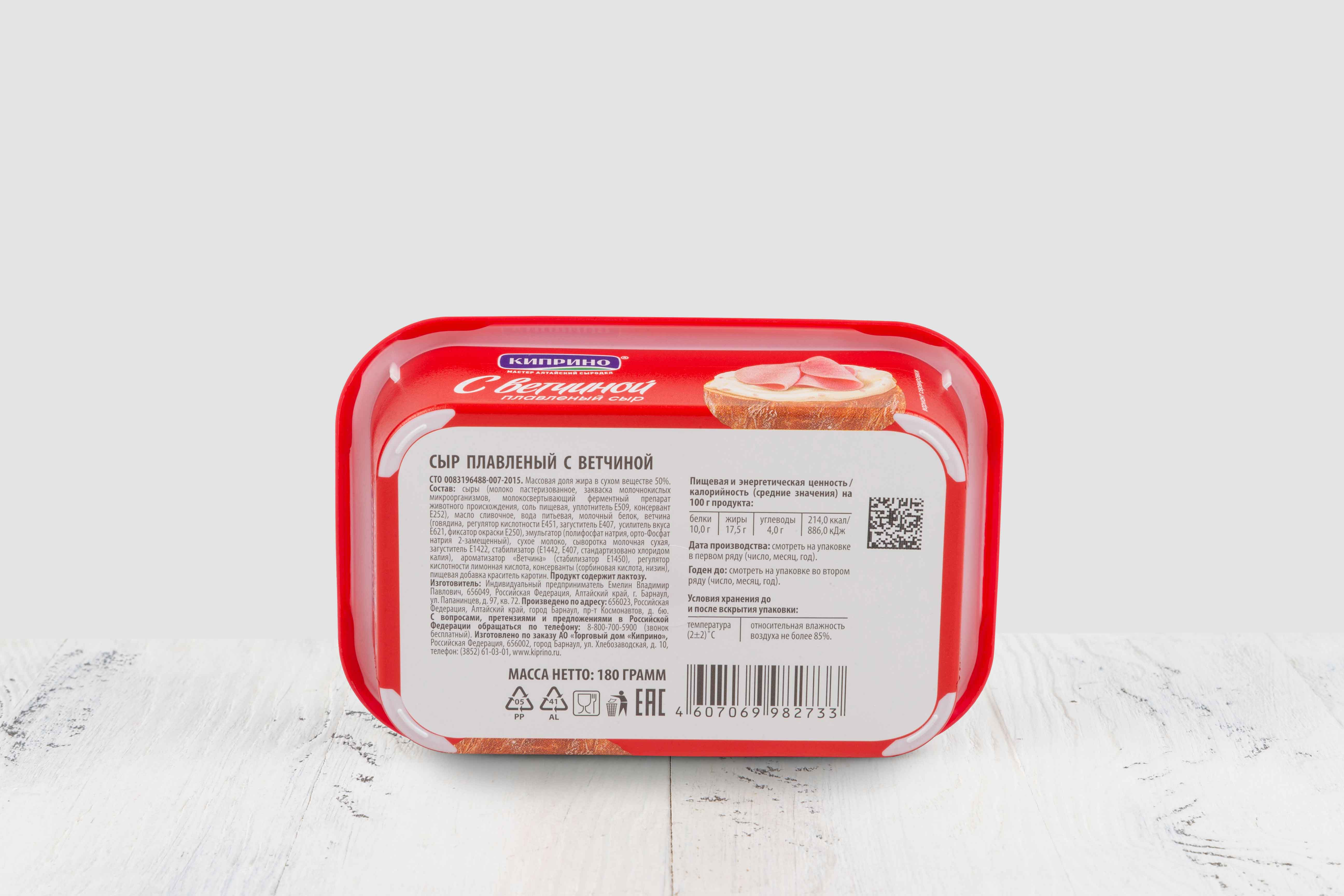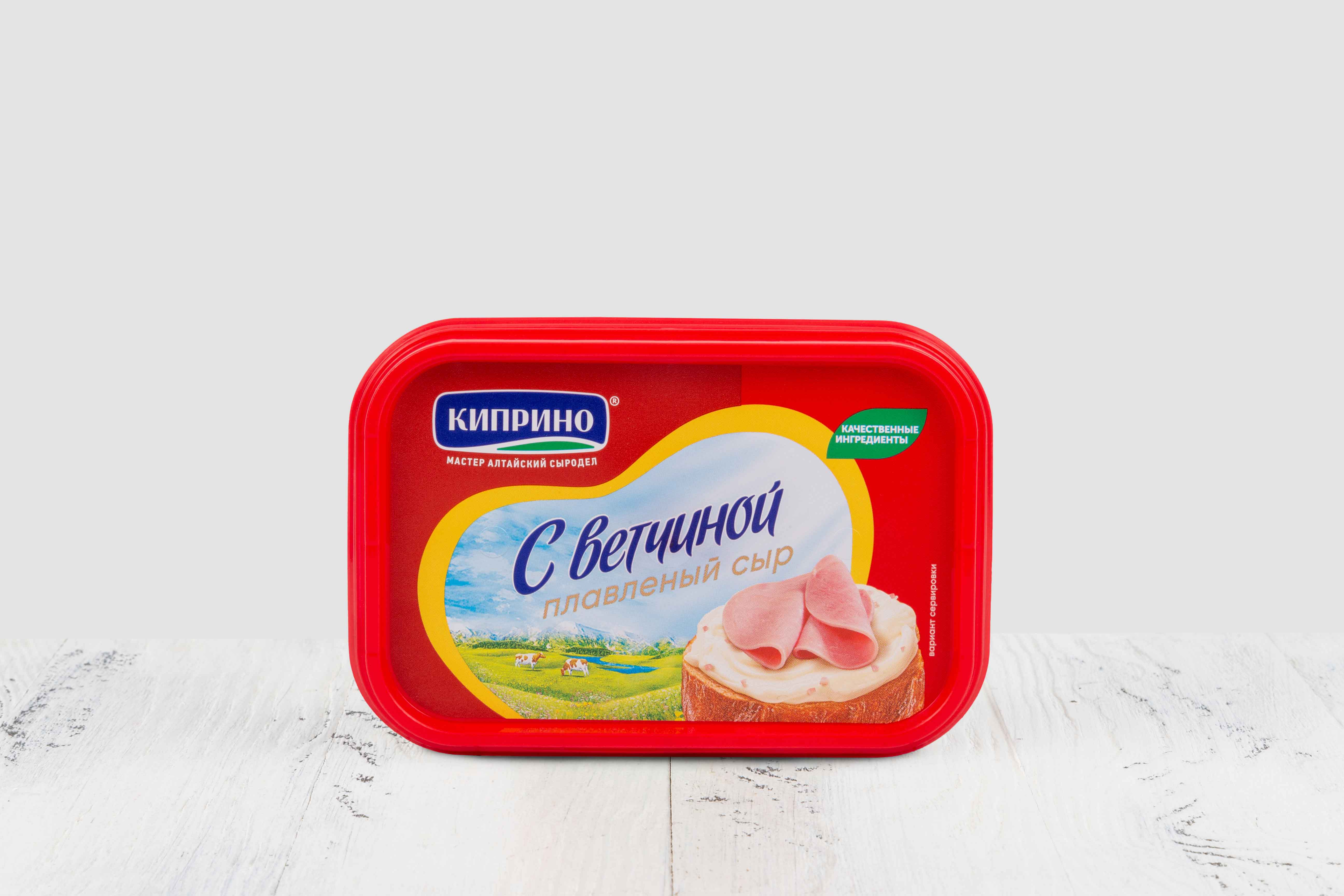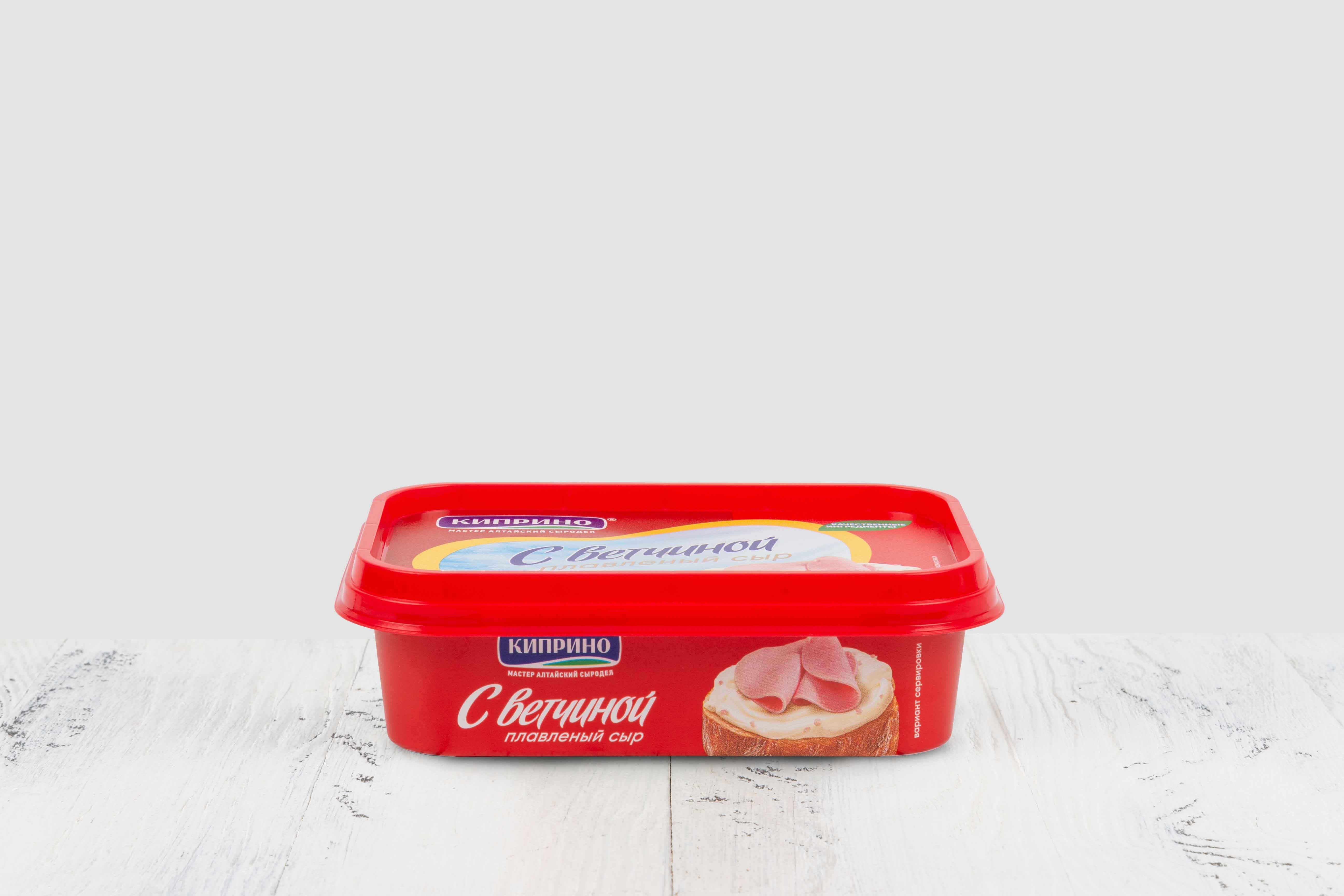 Сыры (молоко пастеризованное, закваска молочнокислых микроорганизмов, молокосвертывающий ферментный препарат животного происхождения, соль пищевая, уплотнитель Е509, консервант Е252), масло сливочное, вода питьевая, молочный белок, ветчина (говядина, регулятор кислотности Е451, загуститель Е407, усилитель вкуса Е621, фиксатор окраски Е250), эмульгатор (полифосфат натрия, орто-Фосфат натрия 2-замещенный), сухое молоко, сыворотка молочная сухая, загуститель Е1422, стабилизатор (E1442, Е407, стандартизовано хлоридом калия), ароматизатор «Ветчина» (стабилизатор Е1450), регулятор кислотности лимонная кислота консерванты (сорбиновая кислота, низин), пищевая добавка краситель каротин. Продукт содержит лактозу.