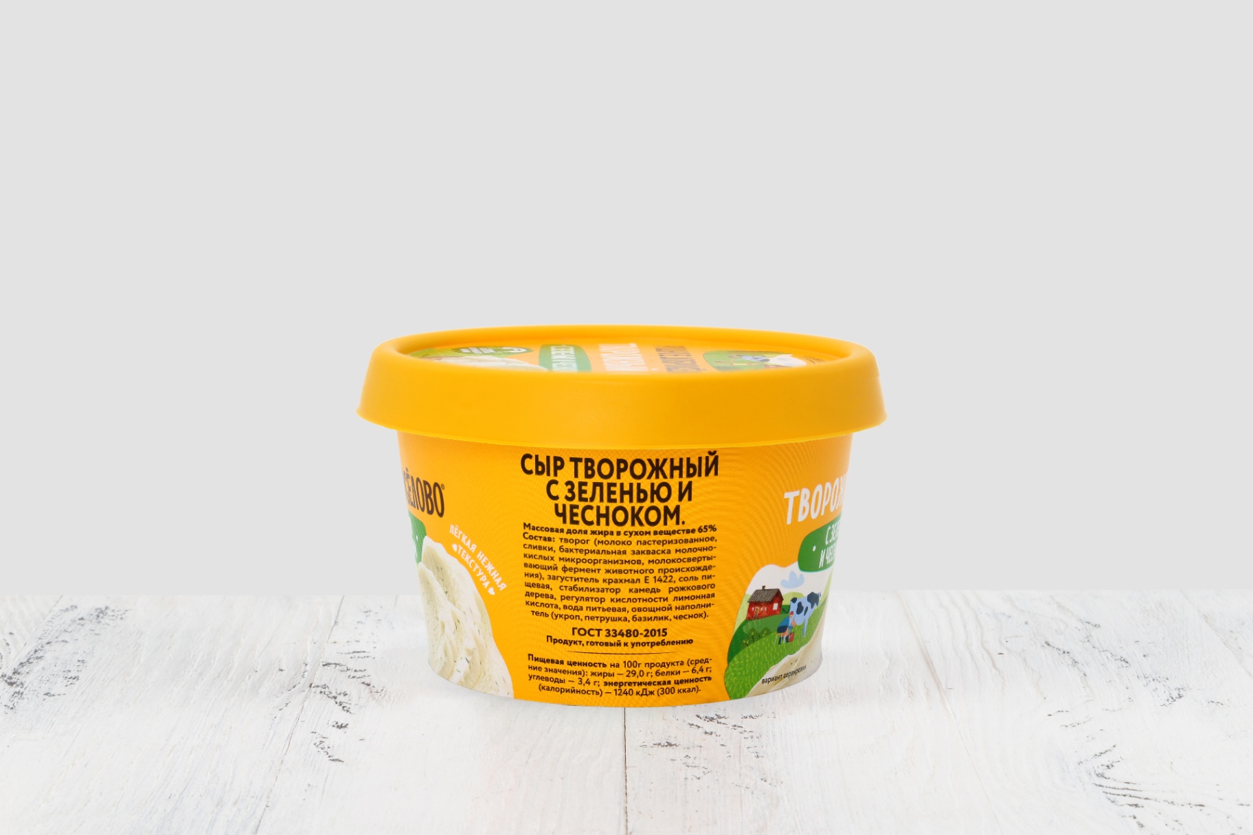 Творог (молоко пастеризованное, сливки, бактериальная закваска молочнокислых микроорганизмов, молокосвертывающий фермент животного происхождения), загуститель крахмал Е 1422, соль пищевая, стабилизатор камедь рожкового дерева, регулятор кислотности лимонная кислота, вода питьевая, овощной наполнитель (укроп, петрушка, базилик, чеснок).